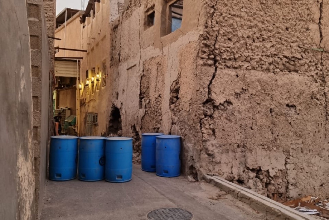 ”براميل الحاويات الخمسة“، المصفوفة في الطريق الضيق بأحد أزقة حي الديرة بجزيرة تاروت، تعتبر دلالة على خطورة استخدام الطريق من لدن المارة.