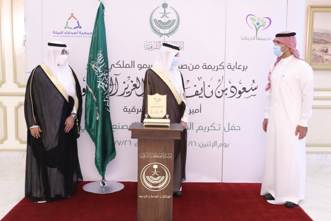 جاء ذلك خلال تكريم أمير الشرقية بديوان الامارة اليوم الإثنين المصانع الفائزة بجائزة ”المصنع المثالي“ التي نظمتها جمعية أصدقاء البيئة والهادفة إلى الالتزام بالبيئة والحفاظ على البيئة الداخلية والخارجية للمصانع والحد من التلوث.