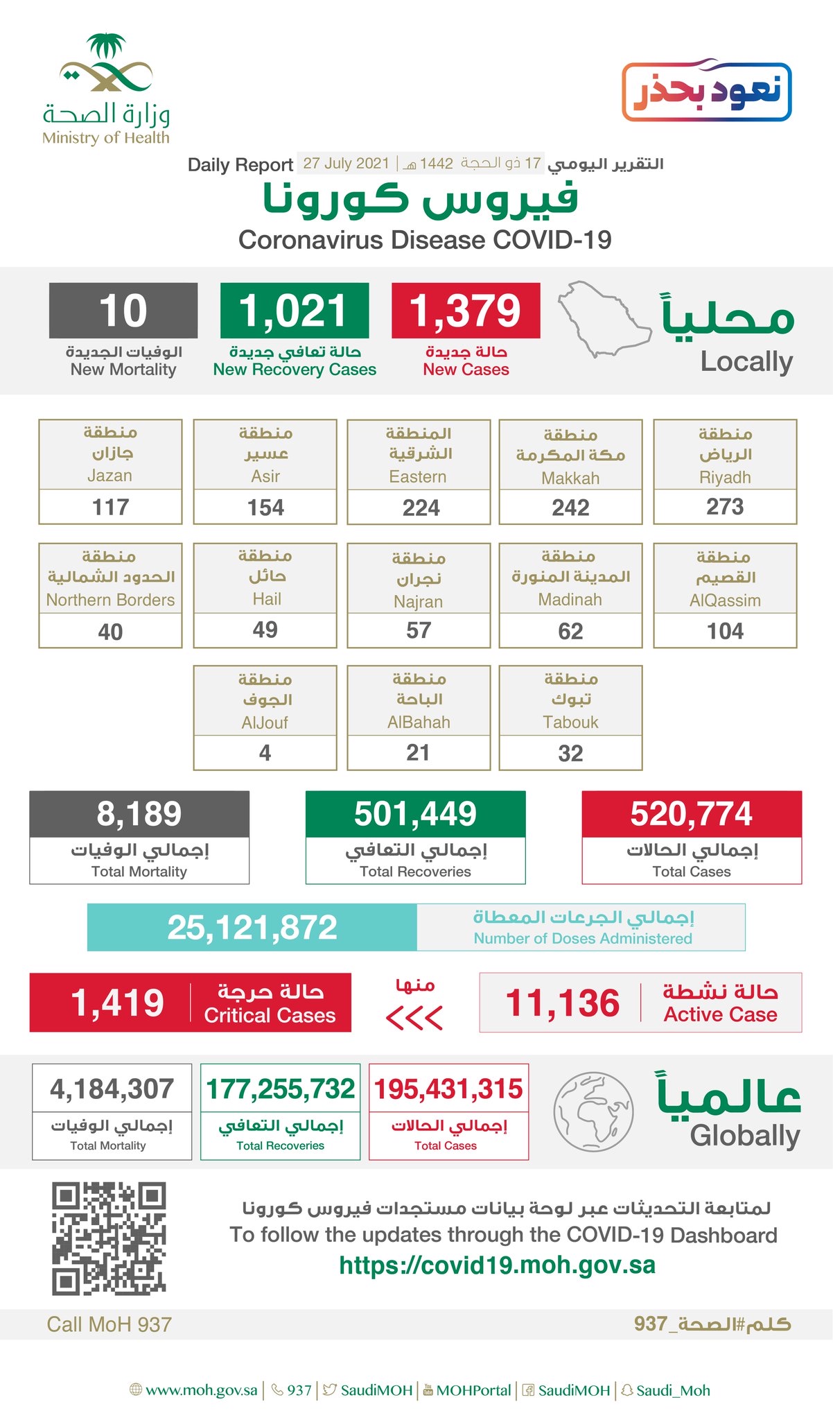 وبينت الإحصائية أن إجمالي عدد الإصابات في المملكة بلغ ”520774“ حالة.