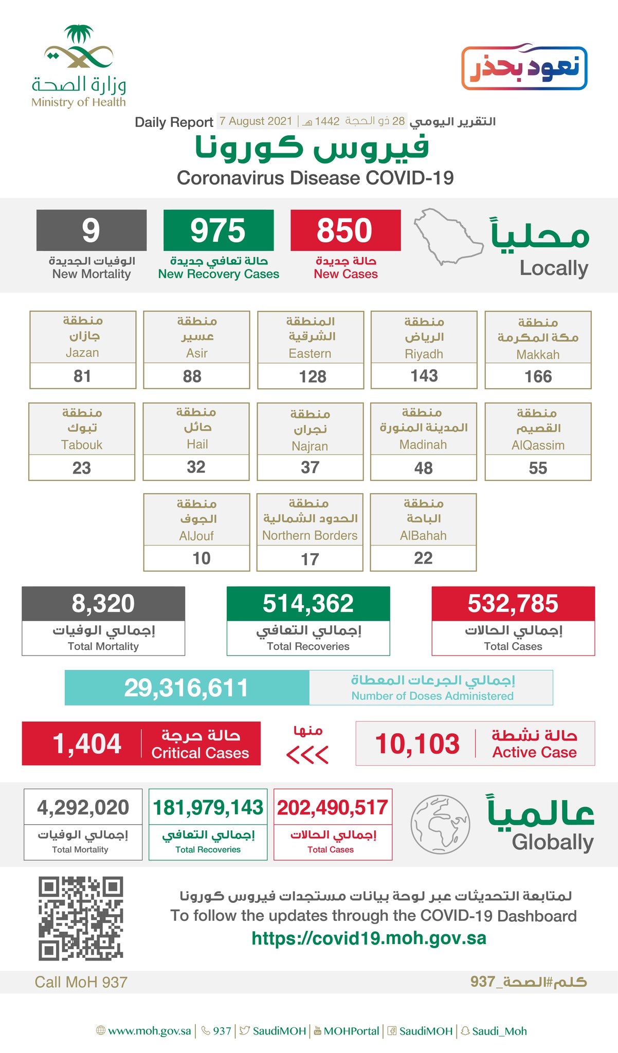 وتتيح وزارة الصحة الاطلاع على مستجدات الفايروس في المملكة، وذلك بنشر إحصاءاتها اليومية على الموقع الإلكتروني https://covid19.moh.gov.sa.