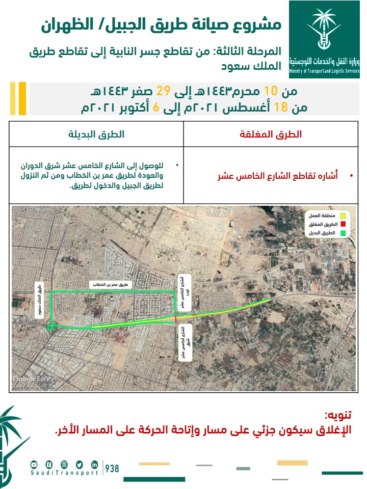 وأوضحت أنه سيتم إغلاق إشارة تقاطع الشارع الخامس عشر، ليكون الطريق البديل للوصول للشارع الخامس عشر شرق الدوران والعودة لطريق عمر بن الخطاب، ومن ثم النزول لطريق الجبيل والدخول للطريق.