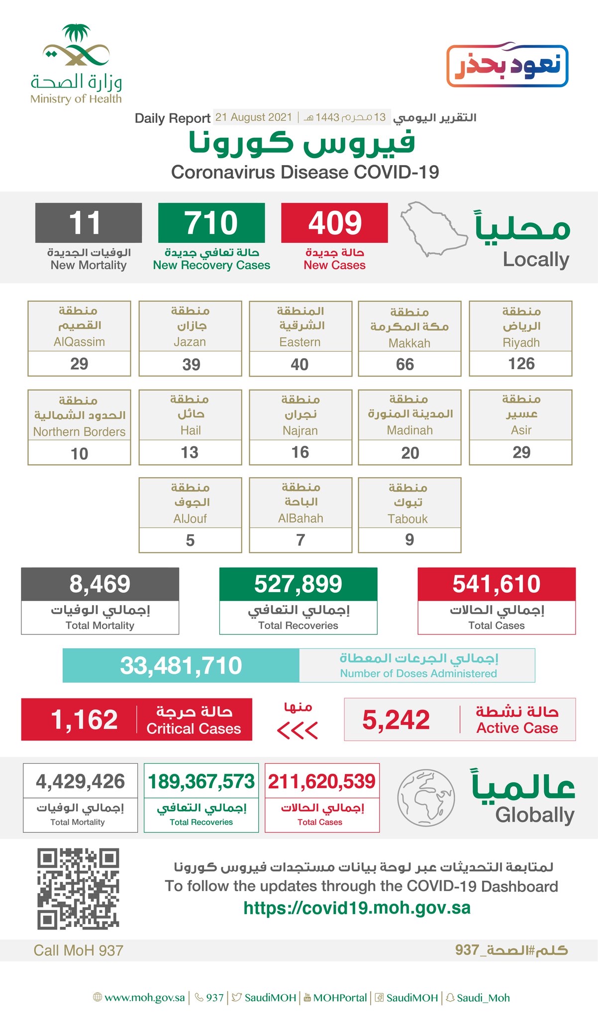 كما أعلنت الصحة عن تسجيل ”710“ حالة تماثلت للشفاء، ليصل مجموع المتعافين إلى ”527899“ حالة تعافي، فيما ارتفع إجمالي الوفيات في المملكة إلى ”8469“ حالة بعد تسجيل ”11“ حالة وفاة جديدة.