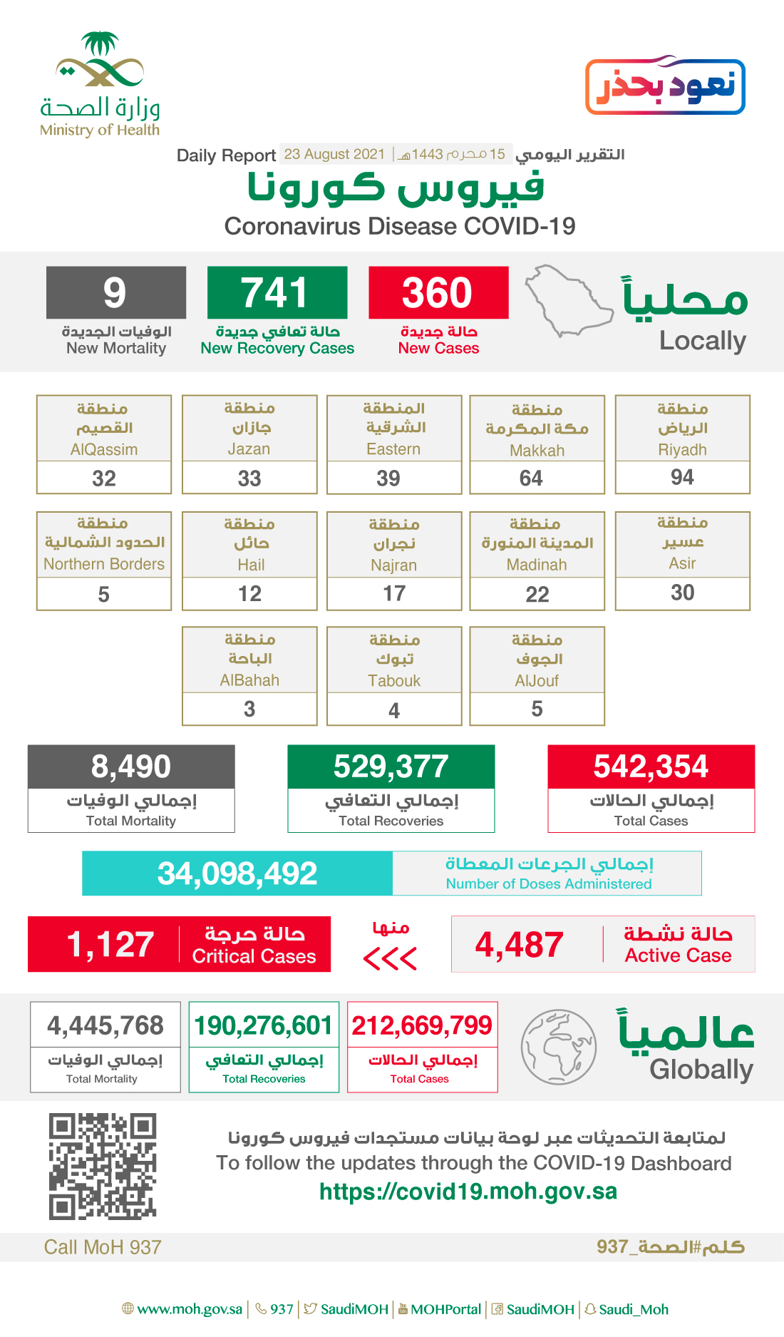 كما أعلنت الصحة عن تسجيل ”741“ حالة تماثلت للشفاء، ليصل مجموع المتعافين إلى ”529377“ حالة تعافي، فيما ارتفع إجمالي الوفيات في المملكة إلى ”8490“ حالة بعد تسجيل ”9“ حالة وفاة جديدة.