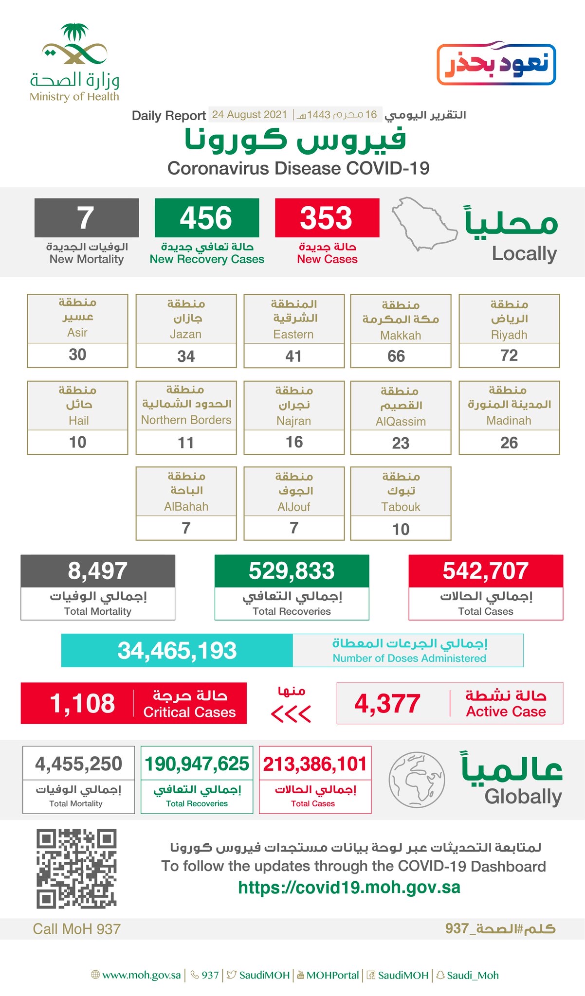 كما أعلنت الصحة عن تسجيل ”456“ حالة تماثلت للشفاء، ليصل مجموع المتعافين إلى ”529833“ حالة تعافي، فيما ارتفع إجمالي الوفيات في المملكة إلى ”8497“ حالة بعد تسجيل ”7“ حالة وفاة جديدة.