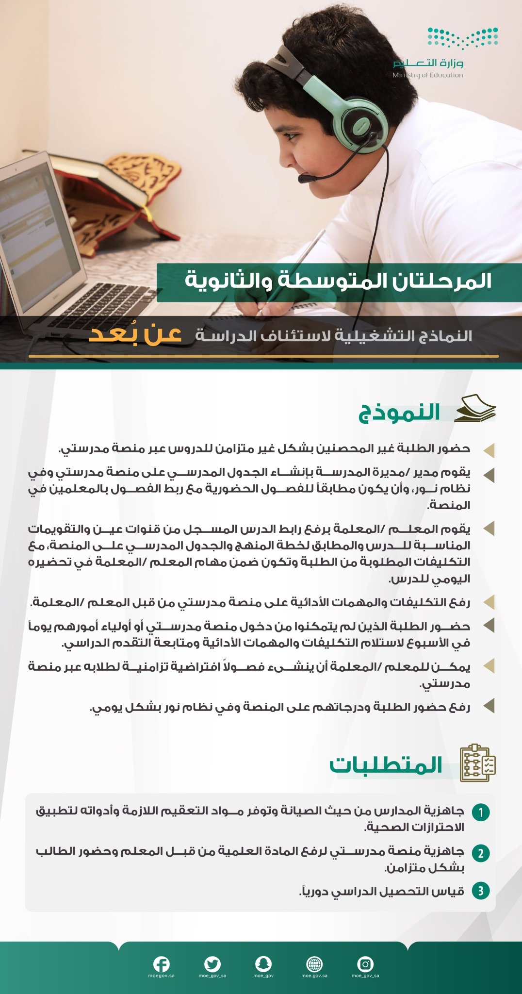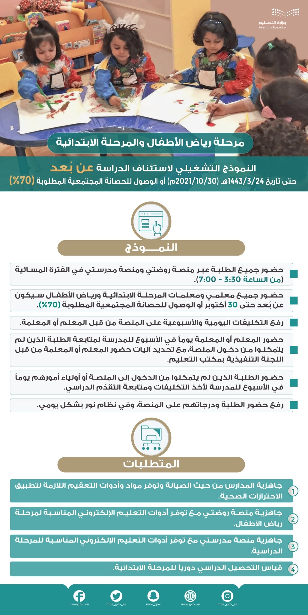 أولاً: تكون الدراسة عن بُعد عبر المنصات التعليمية المعتمدة للطلاب والطالبات في مرحلة رياض الأطفال والمرحلة الابتدائية خلال الفترة المسائية «من الساعة 3:30 مساءً إلى الساعة 7:00مساءً»، وتعود الدراسة الحضورية بدءاً من تاريخ وصول التغطية بجرعتين من اللقاح إلى «70??» من السكان أو تاريخ 1443/03/24ه - الموافق 2021/10/30م أيهما أسبق.