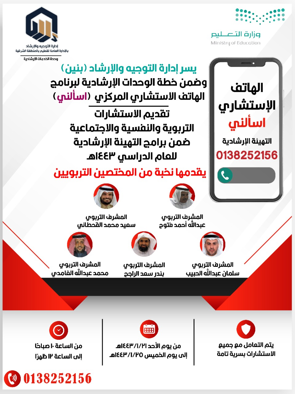 وأوضح مدير إدارة التوجيه والارشاد أحمد الفريدان، أن خدمة الهاتف الاستشاري تستقبل اتصالات المستفيدين بمعدل ساعتين، من ال 10 صباحاُ إلى 12 ظهراً، وتستمر على مدار العام الدراسي فترة الدوام الرسمي من يوم الأحد حتى الخميس، لتقديم الاستشارات التربوية والنفسية أو الاجتماعية المناسبة للمستفيدين وذلك من قبل مختصين من مشرفي إدارة التوجيه والإرشاد على الخط الهاتفي والمخصص للبرنامج ”0138252156“.