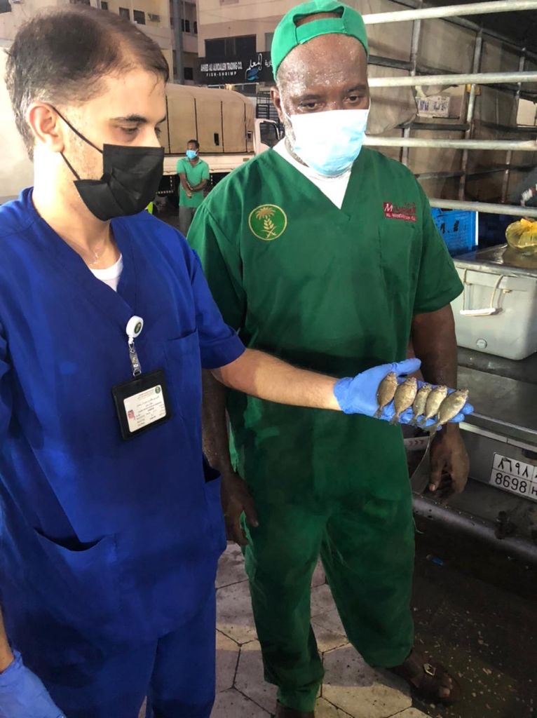 نفذ فرع وزارة البيئة والمياه والزراعة بالمنطقة الشرقية مركز أبحاث الثروة السمكية وبالتعاون مع شرطة محافظة القطيف، عملية تفتيش مفاجئة على سوق الأسماك المركزي بمحافظة القطيف لمعاينة الأسماك المحظور صيدها ”صغيرة الحجم“، أسفرت عن مصادرة وإتلاف ”170“ كيلوجراما من الأسماك من أنواع ”الهامور والصافي والقرقفان“.