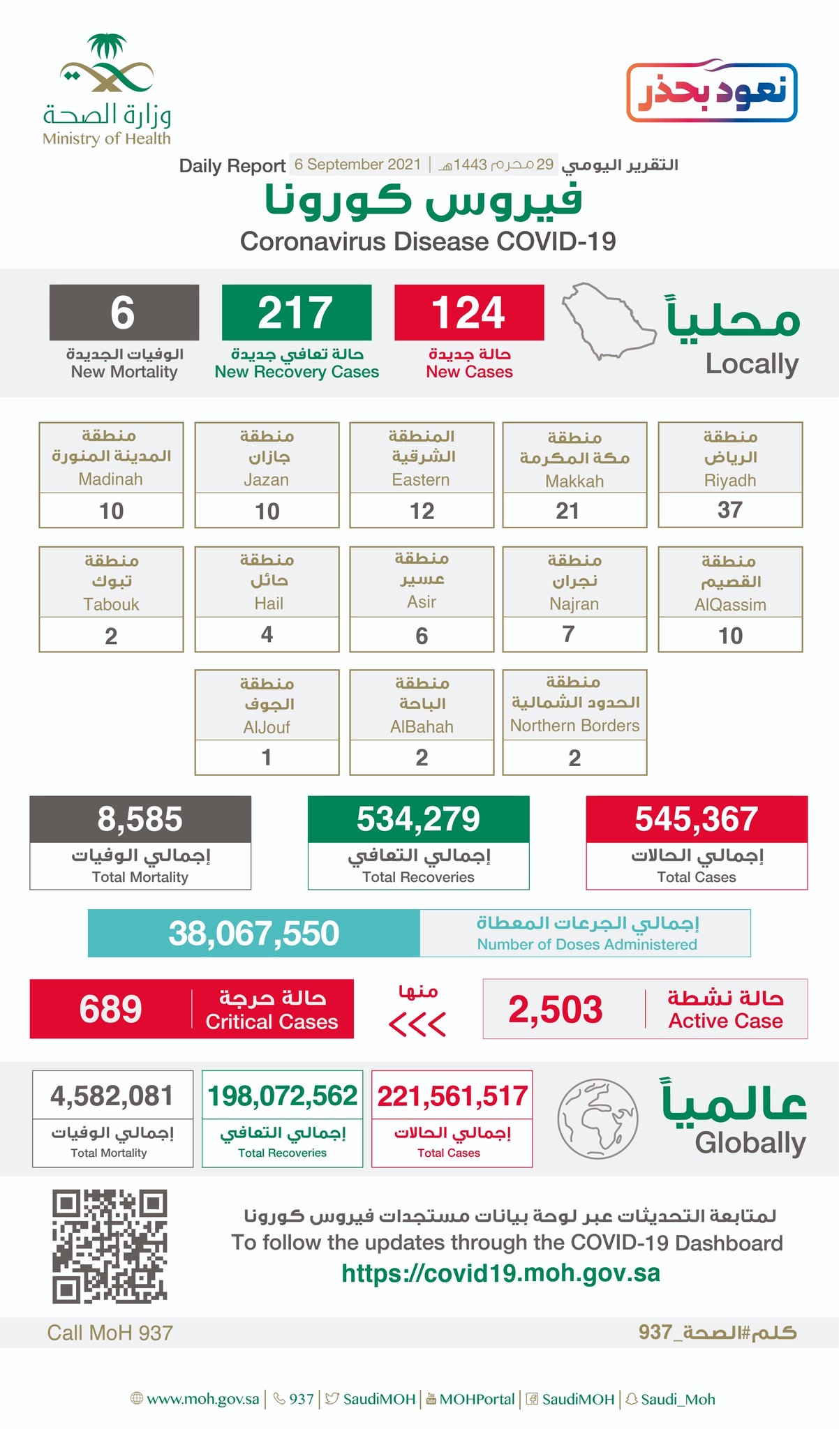 كما أعلنت الصحة عن تسجيل ”217“ حالة تماثلت للشفاء، ليصل مجموع المتعافين إلى ”534279“ حالة تعافي، فيما ارتفع إجمالي الوفيات في المملكة إلى ”8585“ حالة بعد تسجيل ”6“ حالة وفاة جديدة.