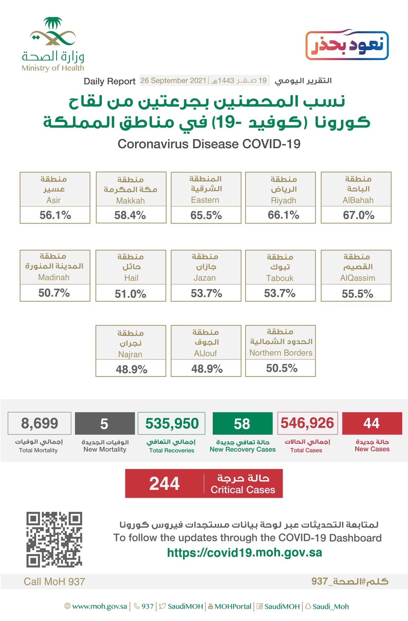 كما أعلنت الصحة عن تسجيل ”58“ حالة تماثلت للشفاء، ليصل مجموع المتعافين إلى ”535,950“ حالة تعافي، فيما ارتفع إجمالي الوفيات في المملكة إلى ”8699“ حالة بعد تسجيل ”5“ حالة وفاة جديدة.