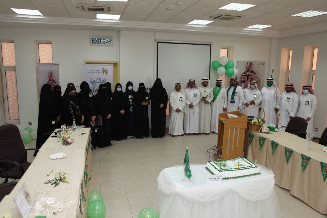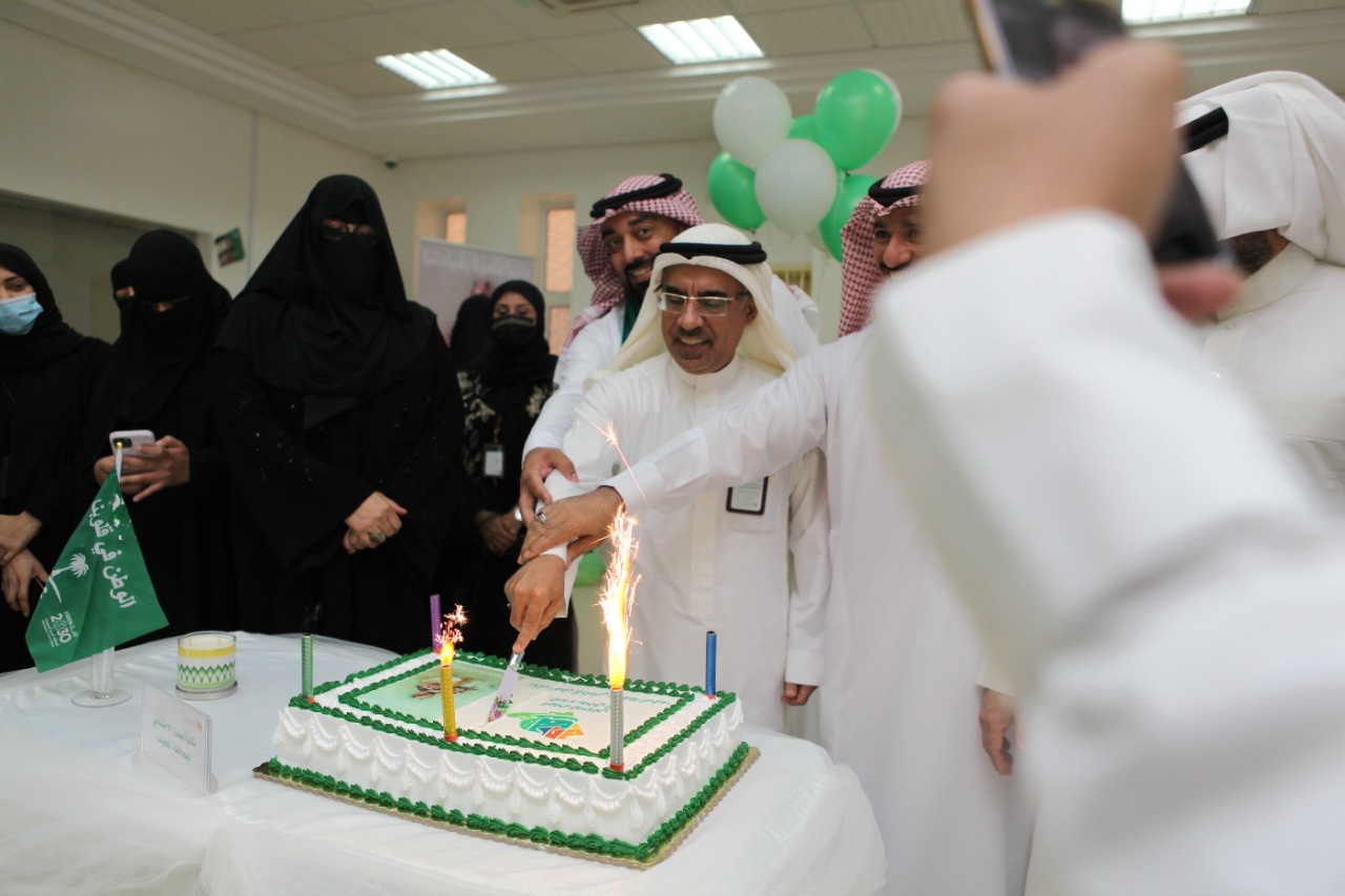 واختتم الحفل بعرض مرئي وبالتقاط الصور التذكارية ورفع الاعلام وسط أجواء مليئة بالوطنية وبتقطيع قالب الكعك بحضور إدارة المكتب وعدد من منسوبي ومنسوبات المكتب.