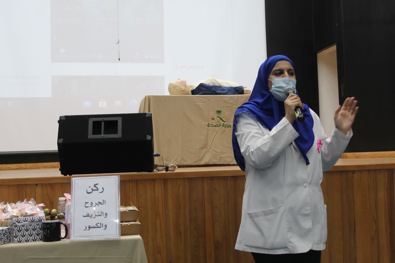 وبلغ عدد الحضور70 متدربة ومنسوبة من خلال أركان جرى خلالها تقديم التوعية التثقيفية وذلك حسب الفئة العمرية لمبادئ ”الإسعافات الأولية“.