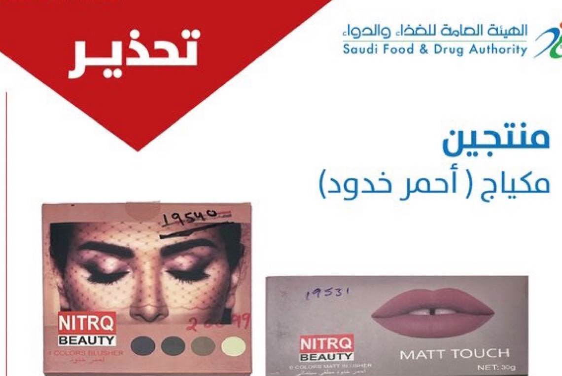 وقالت الهيئة في تعميم لاتحاد الغرف السعودية، ان نتائج التحليل أظهرت احتواء منتجين مكياج يحمل المنتج الأول اسم احمر خدود ”Nitrq Beauty 4 colors blusher 01“ والمنتج الثاني اسم ”احمر خدود مطفي سينمائي Nitrq Beauty 6 colors matt blusher 01“ على نسبة عالية من مادتي الرصاص والزرنيخ تجاوزت الحد المسموح به كشوائب في لائحة متطلبات السلامة في مستحضرات التجميل والعناية الشخصية رقم «SFDA.CO/GSO 1943:2016».