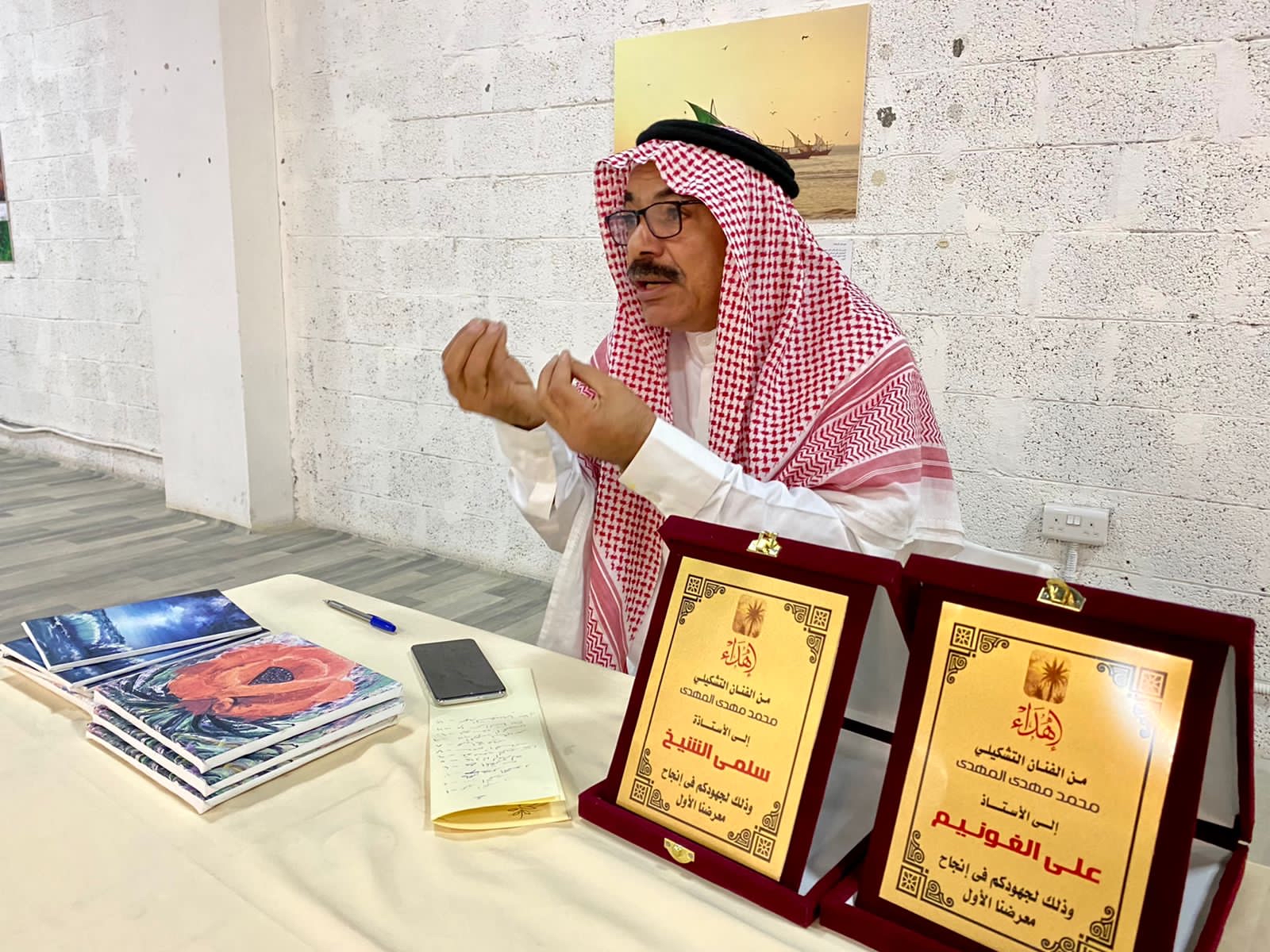 قدم الفنان التشكيلي محمد المهدي، مجموعة من لوحاته التذكارية والميداليات، كتكريم لجميع أعضاء جمعية الثقافة والفنون بالأحساء، ولمجموعة من الإعلاميين المساهمين في تقديم معرضه التشكيلي ”رحلة مع الفن التشكيلي“.