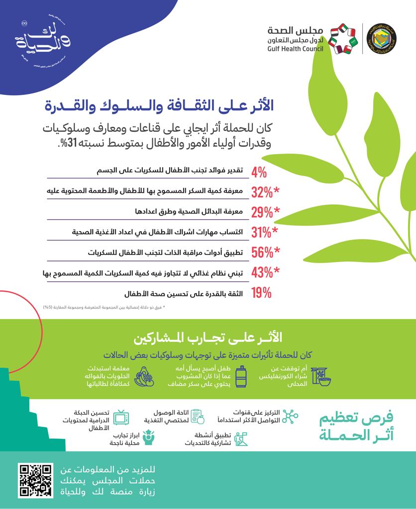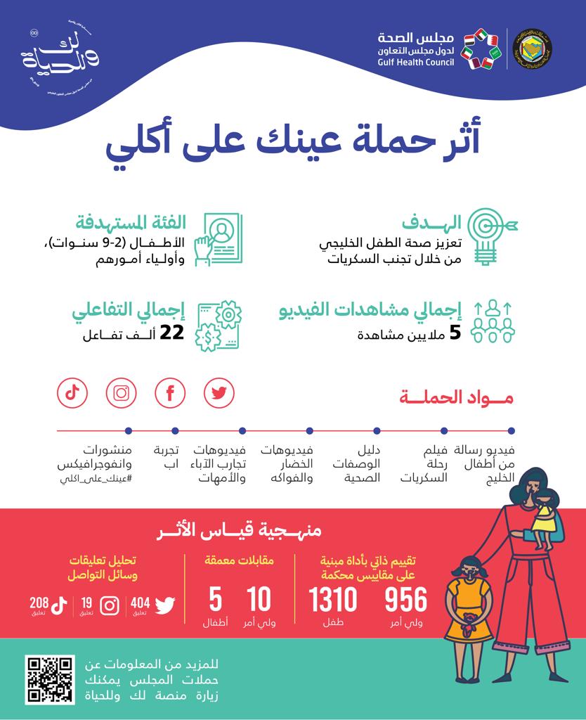 واستطاعت حملة «عينك على أكلي» التي قدمها مجلس الصحة الخليجي ممثلاً بإدارة الصحة العامة بالتأثير الإيجابي بمتوسط ما نسبته 31% على قناعات ومعارف وسلوكيات وقدرات أولياء الأمور والأطفال.