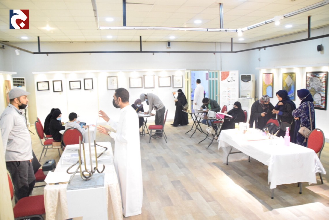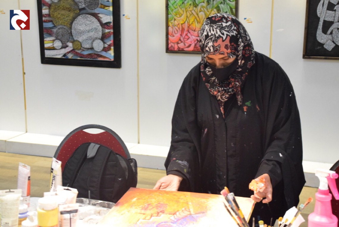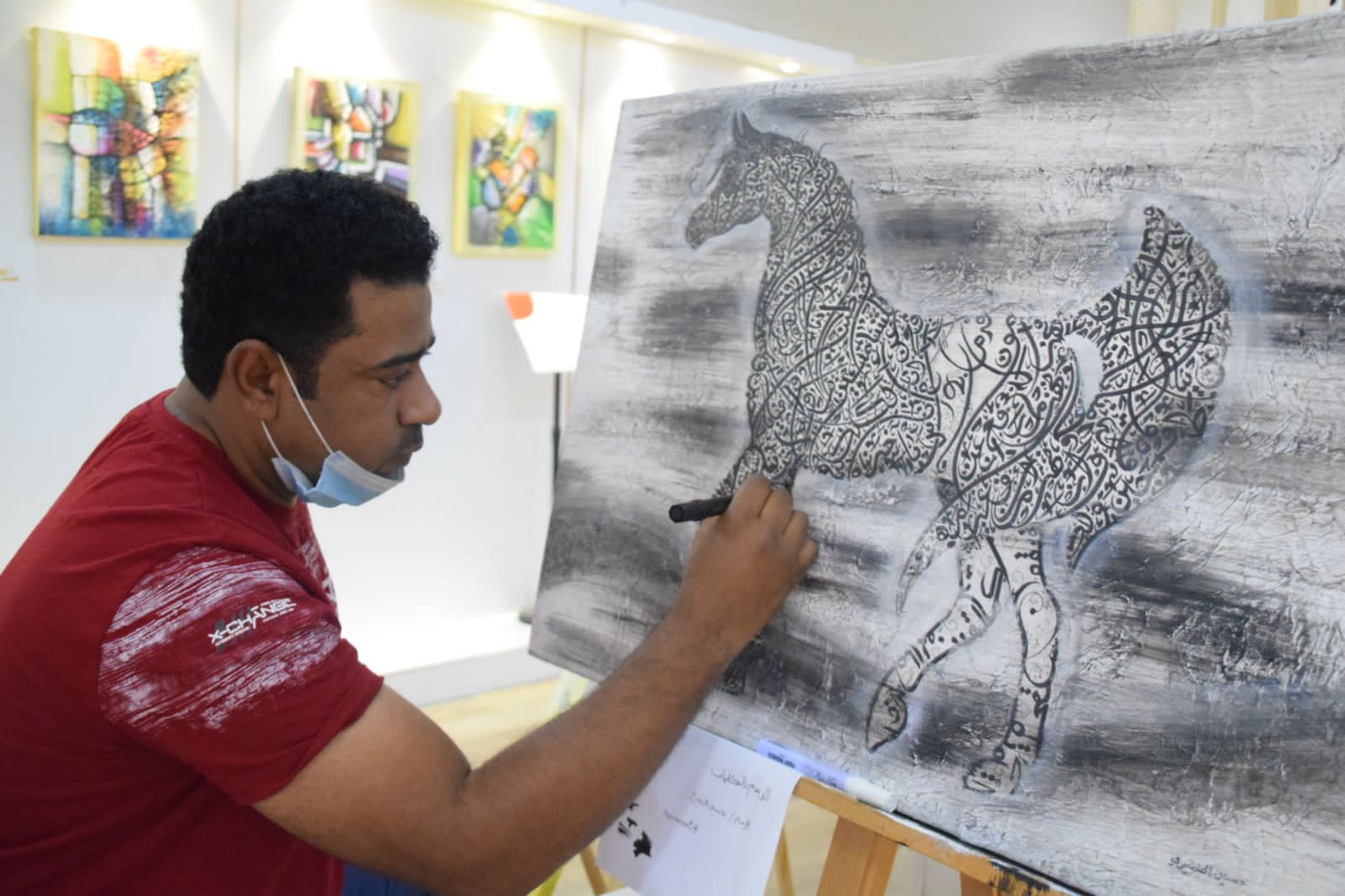 اختار الفنان التشكيلي حسين الخضيري كلمات بالخط العربي ليرسم بها لوحة فرس أصيلة، تختال بين لوحات معرض «مدارس» التشكيلي المشترك.