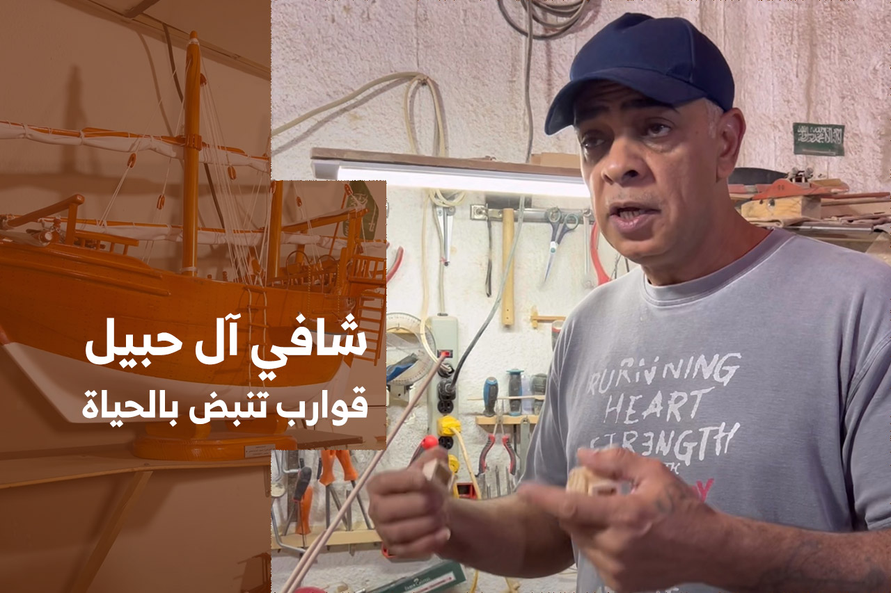 منذ ربع قرن يواصل شافي آل حبيل التعبير عن شغفه في نحت مجسمات السُفن البحرية بأنواعها وأحجامها المختلفة في ورشته المنزلية الصغيرة.