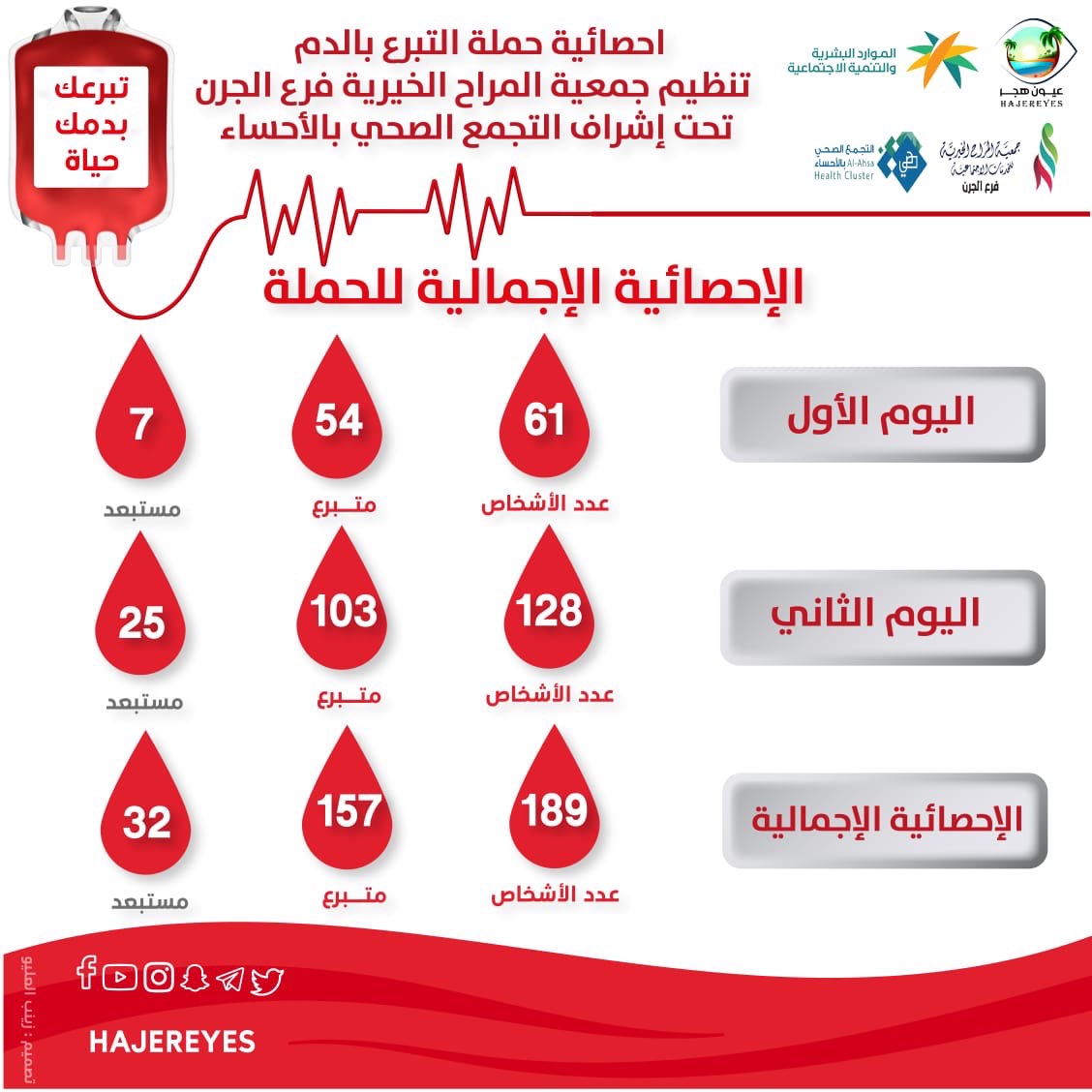 بمقر جمعية المراح الخيرية فرع الجرن بمحافظة الأحساء حملة التبرع بالدم والذى أشرف عليها التجمع الصحي بالأحساء ممثلًا في إدارة المختبرات وبنوك الدم وتنظيم من فريق الجرن التطوعي بالأحساء باجمالي 157 متبرع.