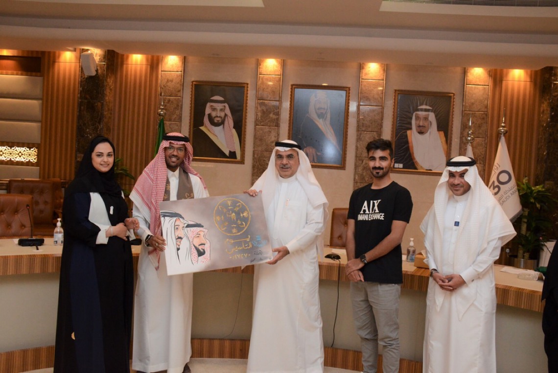 كرم أمين المنطقة الشرقية المهندس فهد الجبير، اليوم، عدد من الفنانين والفنانات التشكيليين المشاركين في مبادرة رسم جدارية ”يوم التأسيس“، بالدمام، تزامنا مع احتفالات المنطقة بيوم التأسيس، والتي شارك فيها عشر فنانين وفنانات، للمساهمة في تحسين المشهد الحضري.