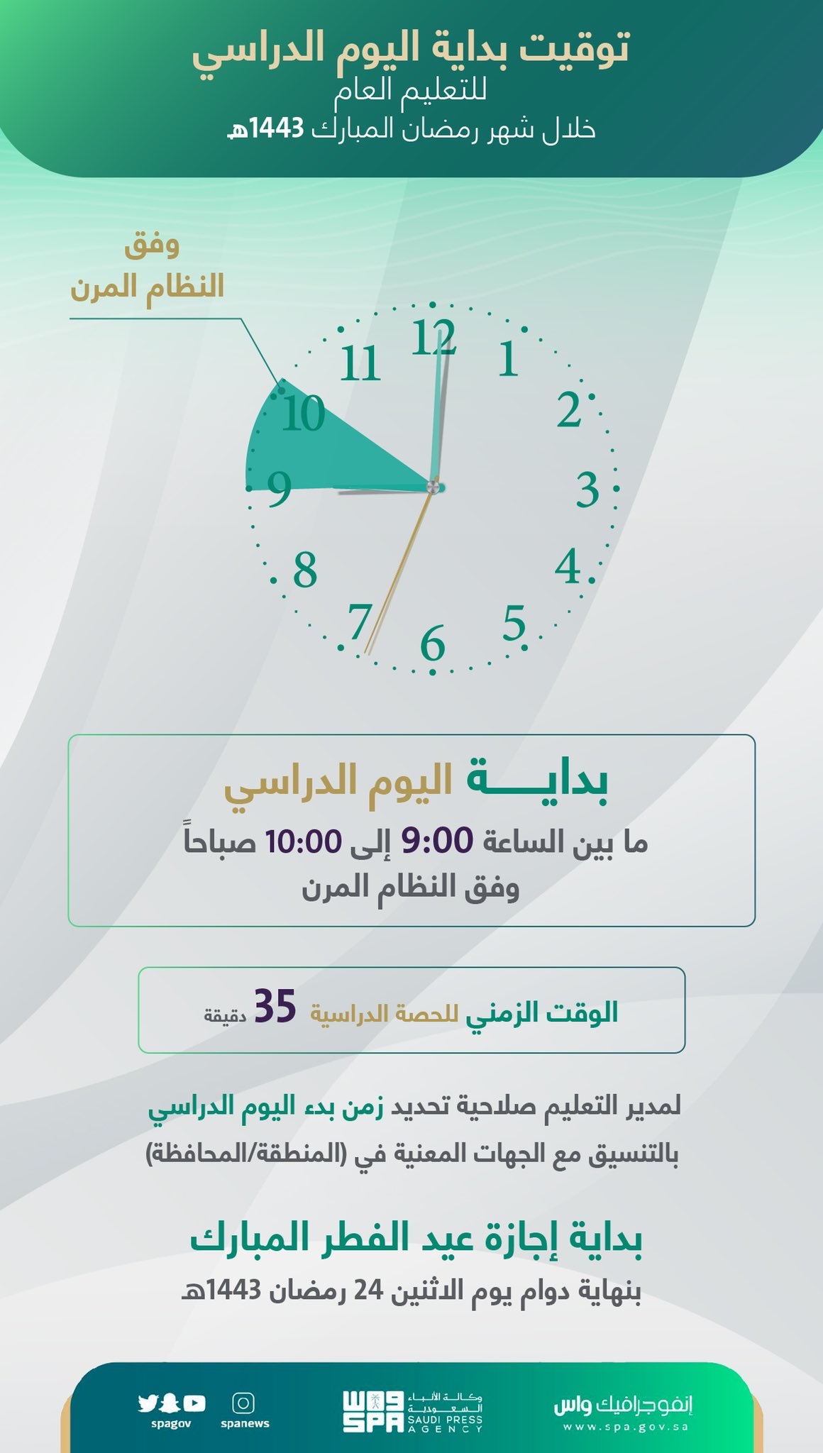 وحدّدت وزارة التعليم بدء اليوم الدراسي ما بين الساعة التاسعة إلى العاشرة صباحاً، وفق النظام المرن، مع تحديد الوقت الزمني للحصة الدراسية ب 35 دقيقة، على أن تبدأ إجازة عيد الفطر المبارك بنهاية دوام يوم الاثنين 24 رمضان 1443 هـ.