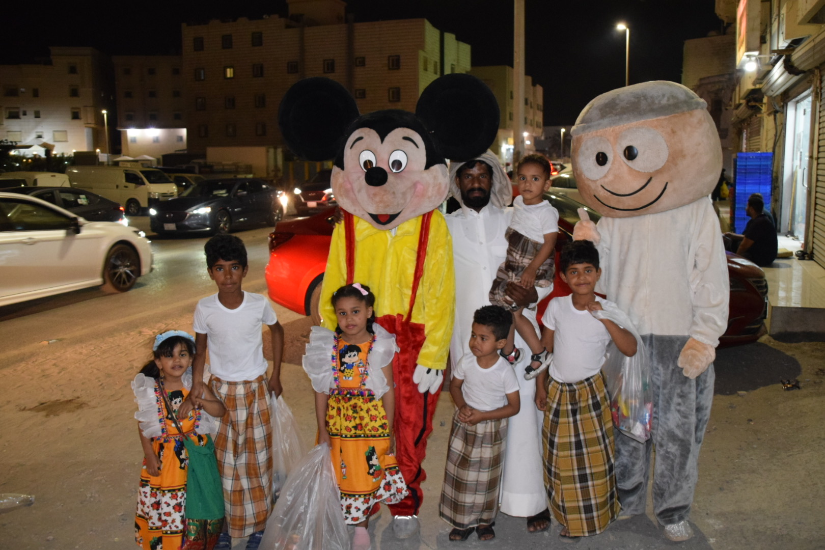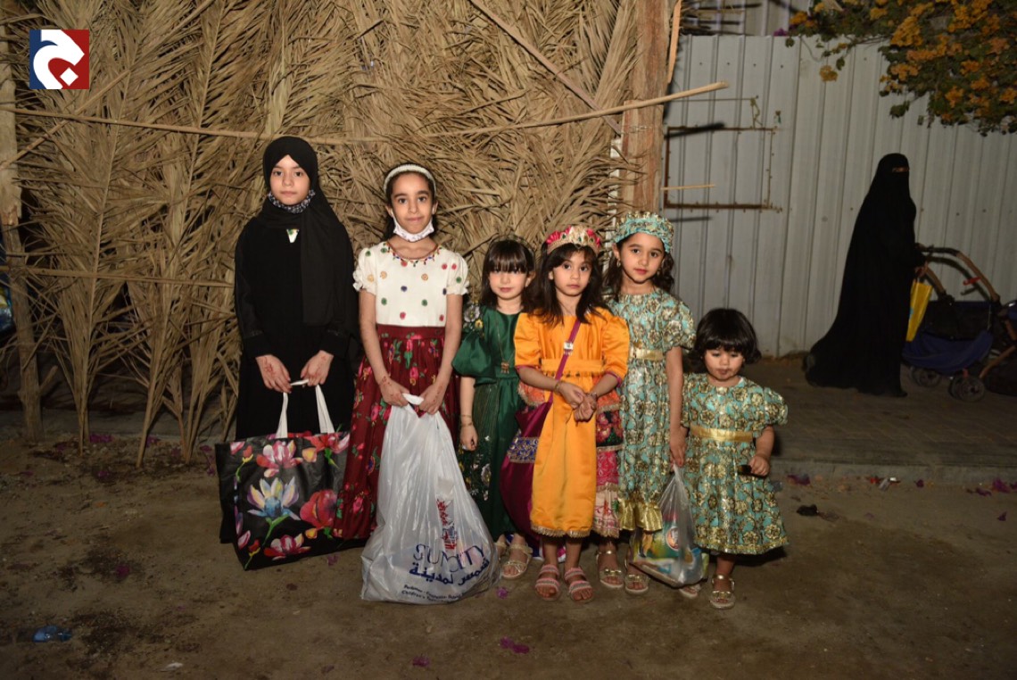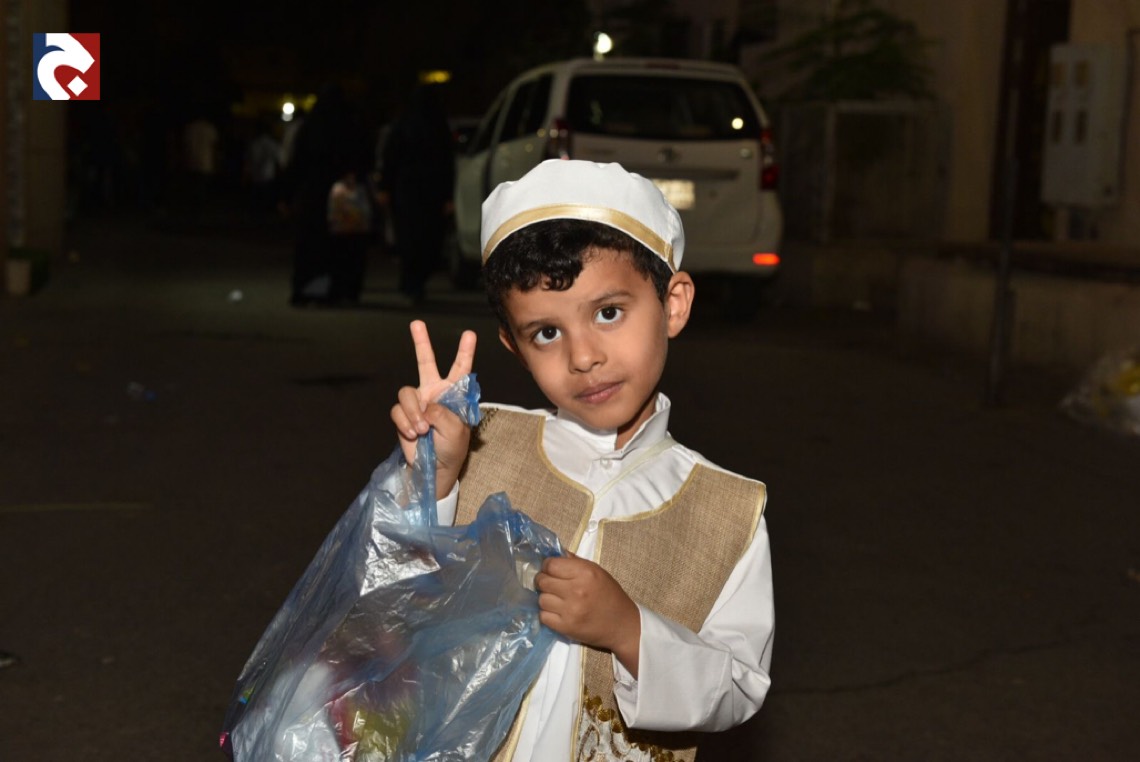 وانتشر الأطفال المتزينين بالثياب الخاصة بالقرقيعان وهم يحملون الأكياس مارين بمنازل الأقارب والجيران لجمع الهدايا والحلويات وهم يرددون بصوت مسموع ”ناصفة حلاوة أعطونا الله يعطيكم“.