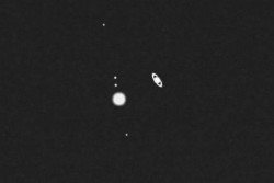 قال المهندس ماجد أبو زاهرة، رئيس الجمعية الفلكية بجدة، إن الراصدين للسماء في السعودية والوطن العربي شاهدوا مساء الاثنين الاقتران النادر بين المشتري وزحل، الذي يوصف ب ”الاقتران العظيم“، وكان لعلماء الفلك الانتظار 800 عام ليرصدوا حدوثه.. كما يظهر في الصورة بسماء السعودية في مدينة جدة. وأضاف بأن الاقتران العظيم رُصد بعد غروب الشمس باتجاه الأفق الجنوب الغربي؛ إذ ظهر الكوكبان مثل ”نجم“ واحد للراصد بالعين المجردة، لكن من خلال كاميرات ... |